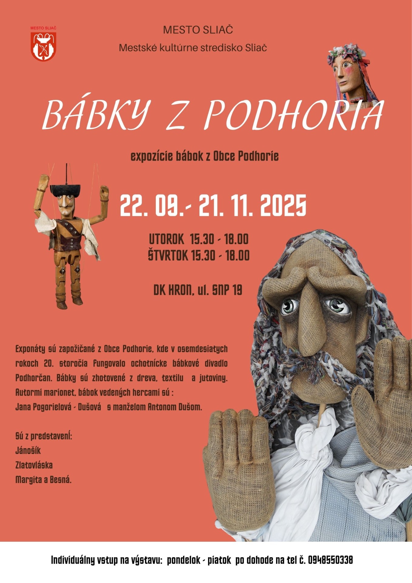 Exponáty sú zapožičané z Obce Podhorie, kde v osemdesiatych rokoch 20. storočia fungovalo ochotnícke bábkové divadlo Podhorčan.