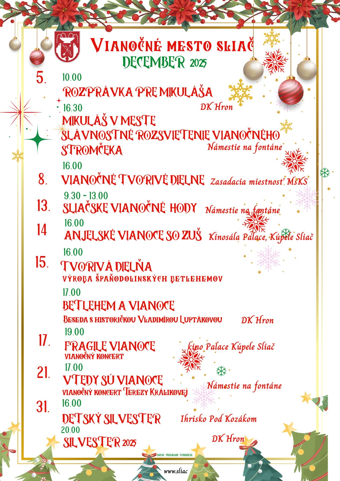 Mestské kultúrne stredisko vás srdečne pozýva na sériu predvianočných podujatí, ktoré prinesú radosť, svetlo a pravú sviatočnú atmosféru. Čakajú vás tradície, hudba, vystúpenia detí, tvorivé aktivity aj spoločné okamihy, ktoré k Vianociam jednoducho patria.