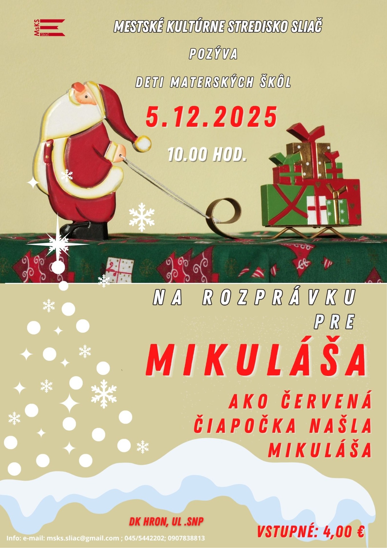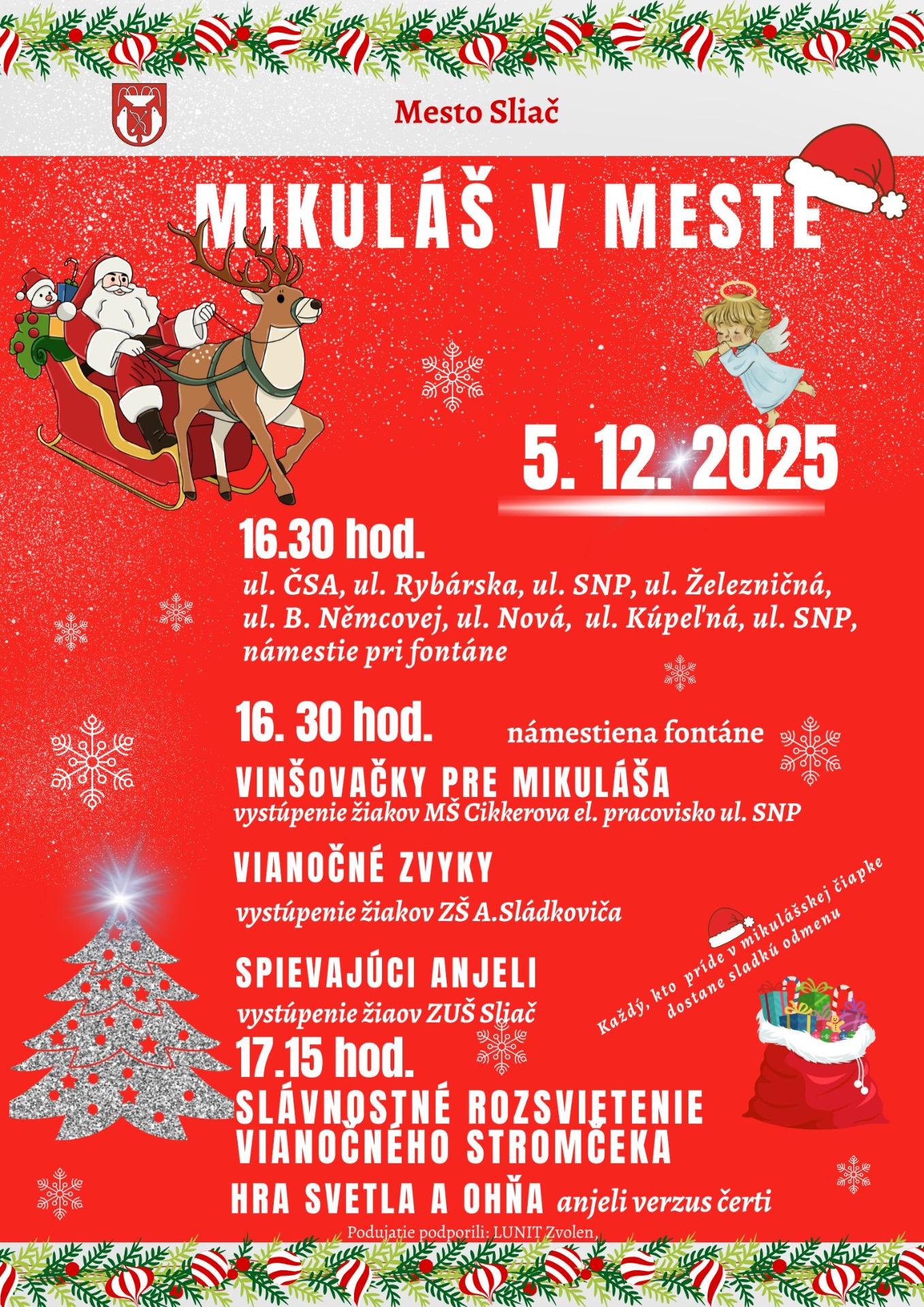 5. 12. 2025 o 16:30 | Námestie pri fontáne. Príďte privítať Mikuláša a užiť si čarovné popoludnie plné hudby, tradícií a vianočnej atmosféry!